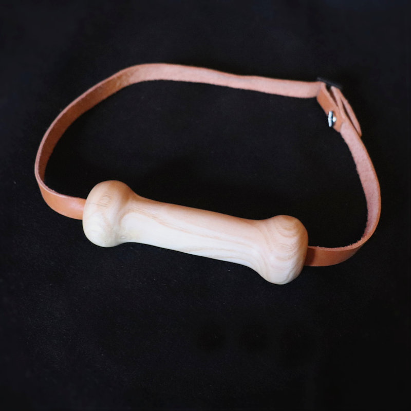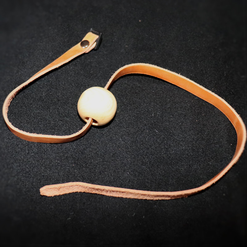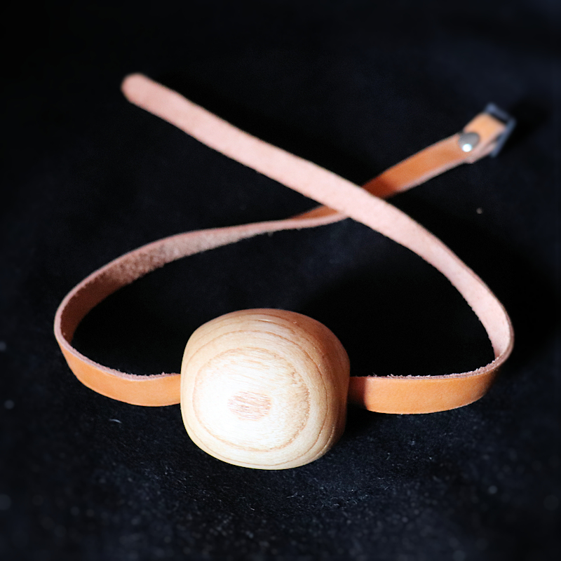 A small ball gag in Ash with handmade 10mm leather strap.Width 30mm